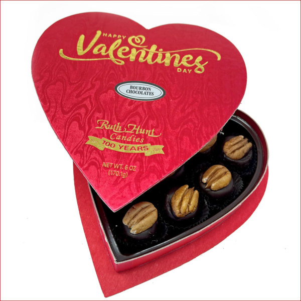 Red Valentine Heart Box filled with Ruth Hunt Bourbon Balls